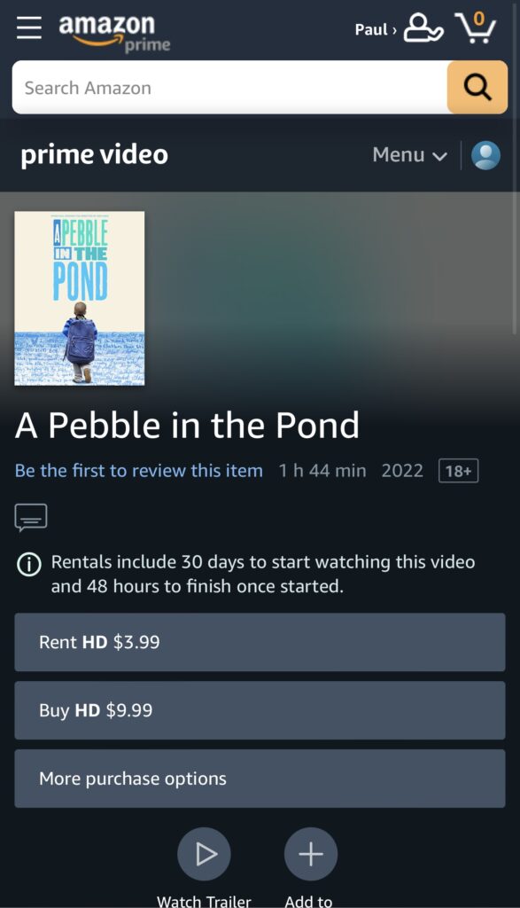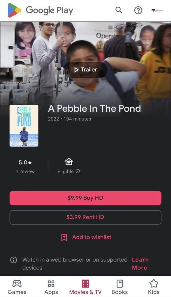 4) For Google Play, super simple click “Rate this Movie” once you have you’ll be able to give it a star rating and then have the option to write some words too!! https://play.google.com/store/movies/details/A_Pebble_In_The_Pond?id=F3kgXA2c670.P&hl=en_US&gl=US