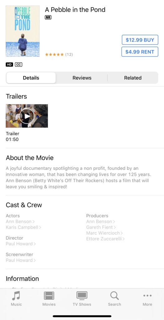 1) For Apple Users, using your iphone or ipad only go to link and click “Reviews” and then “Write A Review” where you can click a star rating (5 Stars!) at the top, then title your review and write a review (optional). Don’t forget to click “Send” when you are done! You may be required to create a Nickname too. https://itunes.apple.com/us/movie/a-pebble-in-the-pond/id1643950551